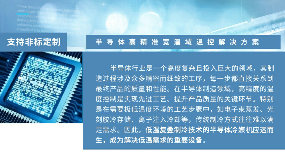 應(yīng)用:半導(dǎo)體生產(chǎn)過程及測試環(huán)節(jié)溫度控制,保障從前端到后端的整體半導(dǎo)體工藝流程穩(wěn)定可靠。