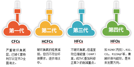 氟利昂類制冷劑在過去幾十年中被廣泛應用,例如R134a、R410a等。