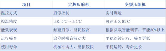 相比之下,變頻壓縮機通過內置變頻驅動模塊,可根據負載變化實時調整電機轉速,從而連續調節制冷量輸出。