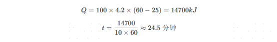假設(shè)有100 kg水(c = 4.2 kJ/kg·℃),需要從25℃加熱到60℃,換熱器傳熱功率為10 kW,則:
